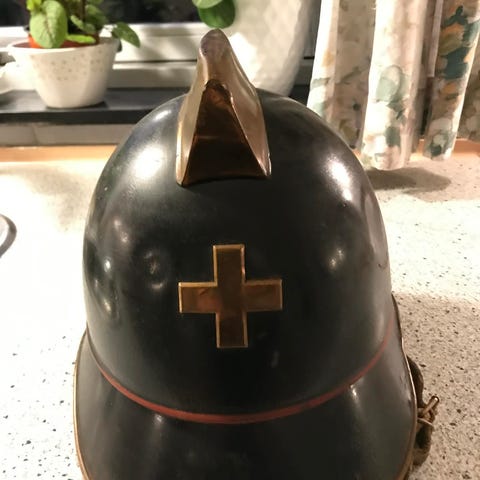 @ Gammel politi hjelm af kobber med logo og tekst fra Metropolitan Police. Tænker at den produceret i England.