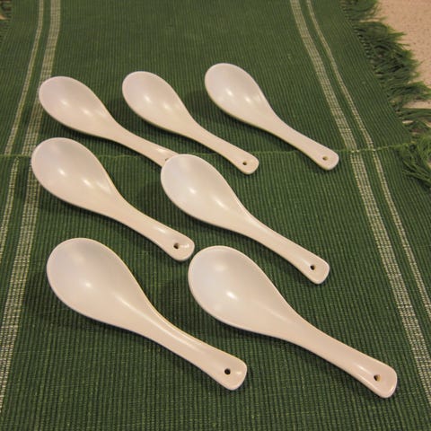 Porcelæn, 5 suppeskeer, Kinesiske, 5 kinesiske suppeskeer med riskorn mønster i porcelænen og rødt håndmalet mønster.
