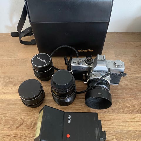 Minolta, spejlrefleks, God, To Minolta spejlreflekshuse med tilhørende objektiver. Alt fungerer. Alt i tilbehør inkl. forskellige linser, fjernbetjent blitz med fod mv.