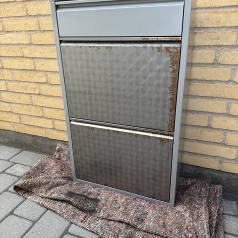 Skabet er i grå aluminium og m/glashylde i børstet hærdet glas. Indeholder 4 skuffer m/plads til to par sko i hver. I skufferne er der en pind, der holder skoene adskilt.