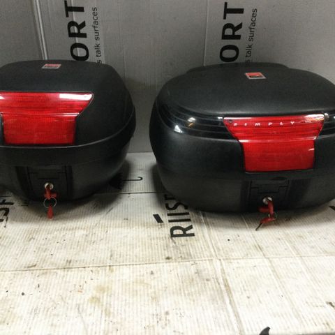 Topbox med plade, Har flere små topboxe. Grå 98kr. U. Plade. Sorte 148kr. Med plade 198kr. Givi 30L. med plade .298kr. . Givi med plade og ryglæn 298kr. Givi Simply med ryglæn 498kr. .Har nyt Bremselys kit til dem til 125kr .Kappa