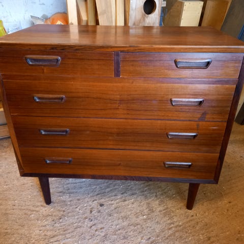 Kommode, b: 78 d: 40 h: 105, Frankenstein møbel, oprindelig i teak, så malet sort, så hvid og nu tilbage i teak.