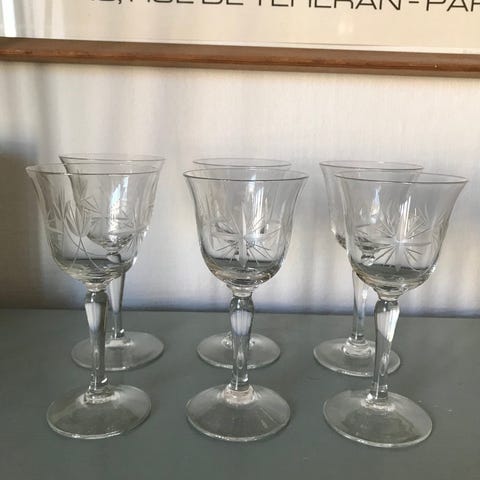 Glas, PORTVINSGLAS , BETTY med ÆTSNING nr. 1., 12 dessert vinglas, designet i 1934.