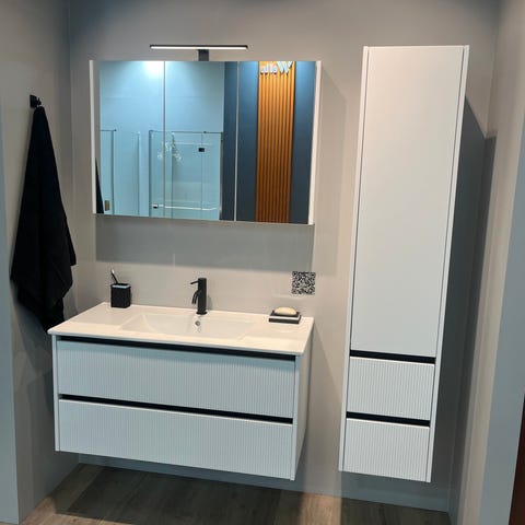 Både underskabet og spejlskabet har tre låger med aluminiumshåndtag og to justerbare hylder, der giver god plads til opbevaring af toiletsager.