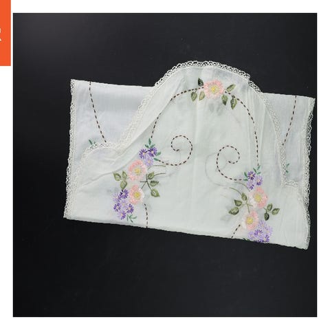 Smuk bordløber med blondekant og broderede blomsterranker i sart lyserød/grønne farver og 2 stk. brødservietter med blomsterkanter.