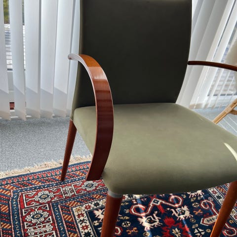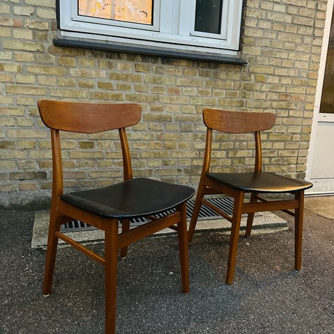 Jeg har 6 styks og sælges helst samlet. 450 kr pr styk ved 6 styk. 650 pr styk ellers. En ompolstring har nogle af dem nok gavn af grundet slid, men de er ikke hullede. 2 af dem har nogle store ridser i ryglænet