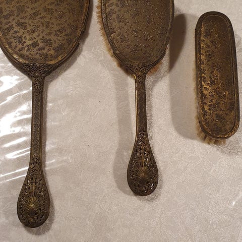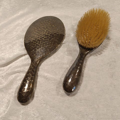 Håndspejl og børste, Meget fin og velholdt spejl og børste i messing. Minimale brugs- og aldersspor, og messingen også pæn, ligeså spejlet som er uden pletter/skader. Kender ikke alder og ved ikke hvad materialet på bagsiden af spejl og børste er lavet af (kan ligne skildpadde, da det er lidt "perlemorsagtigt" ???). Højder: 29 cm og 22 cm.