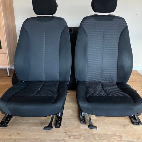 BMW bilsæder i gråt stof. Sættet omfatter forsæder med nakkestøtter og armlæn samt bagsæde i matchende gråt stof. Sæderne er udstyret med skinnesystem til montering i bilen. Velegnet som erstatning for eksisterende sæder eller til opgradering af kabinen i en kompatibel BMW-model, hvor der ønskes stofsæder i grå farve.