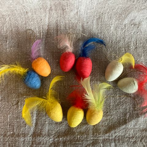 Gamle farverige æg, Der er 2 af dem, der er på str. med alm. æg og maasange af de små, og alle i samme vat agtige materiale som man tidligere brugte til både jule og påskepynt.