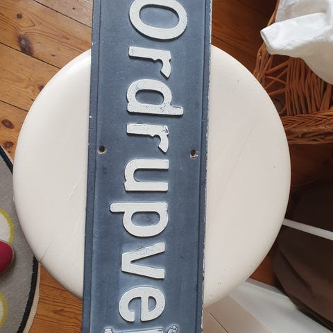 Skilt , Urban Cruiser, Fedt skilt med patina, som kan hænge mange forskellige steder i boligen. Der er huller til ophæng. Skiltet er blevet gulligt med årene. Det er hård plast. Skriften er mørkegrå. Måler 12 x 50.