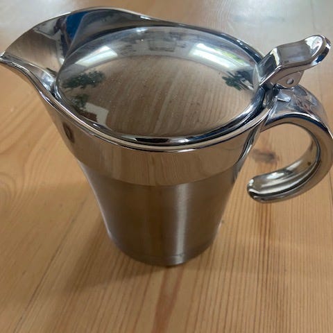 Rustfrit stål, Lille sovsekande + tilhørende skål i rustfrit stål, Højde: 4-5 cm. Længde: ca. 10 cm.