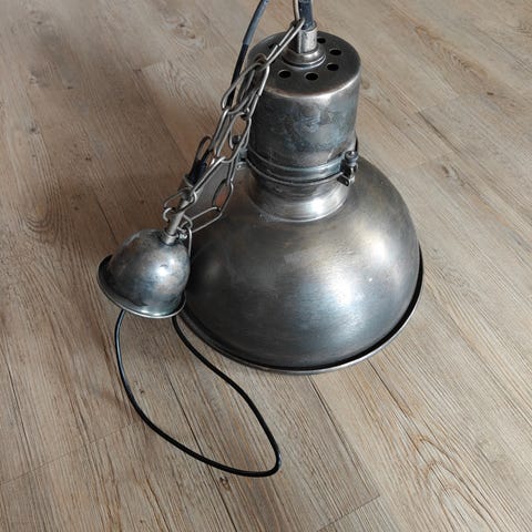 Anden loftslampe, industrilampe, flot lampe 55 cm H, 40 cm Ø skærm, det grå er metal, det nederste er kraftig plast.