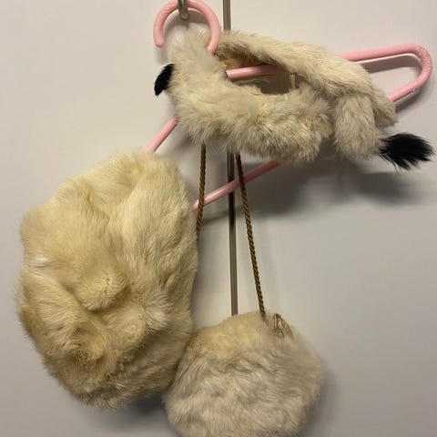 Vinterjakke, “Pelsfrakke” , hue, halstørklæde og vanter, KG Børnekonfektion, str. 92, Dobbeltradet fin hvid “pelsfrakke” (acryl og polyester) str. 91. Ingen pletter, fra røgfrit hjem. Kr. 125,-