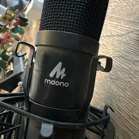 Mikrofon på stativ til pc, Maono, Mikrofon ophængt i to elestikker. Beslag til at sætte på bordkanten medfølger. USB A til USB B kabel medfølger ikke (printer USB kabel)