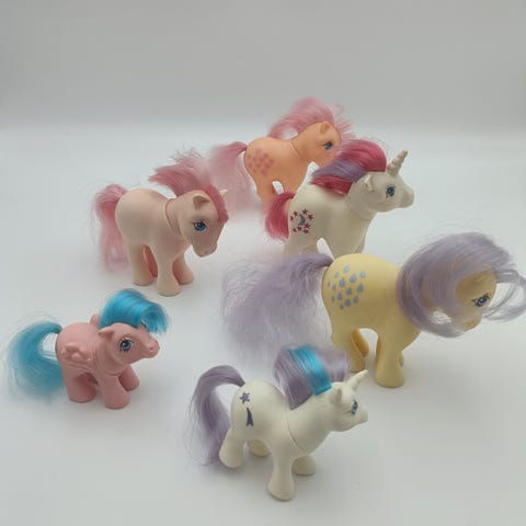 My Little Pony, Baby ponyer, Hasbro, 3 søde vintage My Little Pony babies, Baby Surprise, Baby Cotton Candy og Baby Blossom, medfølgende sutteflasker og rangle og bamsebørste, 2 af ponyerne har et par streger og andre men få brugsspor