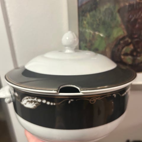 Porcelæn, Kæmpe suppeterrin Blå blomst Rosenknop, Royal Copenhagen, L 35,5, B 26,5 H 30. Prof. Afskåret indvendigt ved ske åbningen, for at anvende større ske. Sjælden udgave
