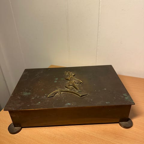 Skrin Art Nouvaux, tin, J korpus, 120 år gl., Art Nouvaux hammerslået skrin med monogram RF på låget, på 4 fødder, stemplet J korpus 11,5 x 9 x 5 cm indvendigt beklædt med træ, smuk patina, vurdering 1500,- kom med et bud, pæn stand, ingen buler eller skader