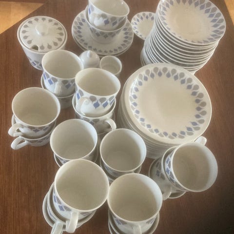 Porcelæn, Kaffe/testel, Daniels 66, 14 stk kaffekopper ( 7 cm høje) Stk pris :20,- 11 stk Kaffeunderkop( 13,5 dia) Stk Pris : 20,- 7 stk teunderkop ( 14,5 dia) Stk Pris : 20,- 5 stk kagetallerken ( 16,5 dia ) Stk Pris : 25,- 2 stk Sukkerskål ( 9 x 9 x 5,5 cm ) Stk pris : 25,- 1 stk flødekande ( 12 incl tud og hank x 7,5 x 5,5 cm ) Pris : 25,- 2 stk frokosttallerken ( 20,5 dia ) Solgt 2 stk middagstallerken ( 23,5 dia - lidt slidtage ) Solgt 19 stk dybe tallerkener…8 tilbage Stk pris 30,- Kan købes samlet for 500,-