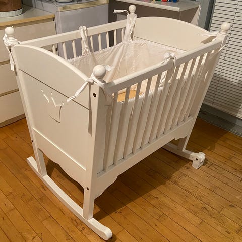 Babyseng, b: 45,5 l: 86, Velholdt, klassisk Dream tremmeseng i træ fra JLY med justerbar bund. Benene har monteret hjul, hvilket gør det nemt at flytte den rundt i boligen.