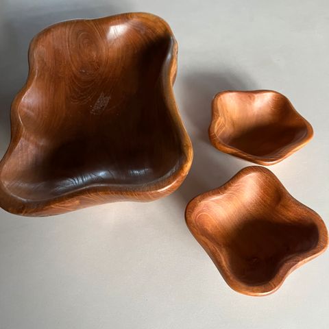 Hånddrejet træskåle, Træskåle, 3 stk. hånddrejet træskåle der er helt let og delikat i sit udtryk. Smuk som dekoration i alle rum eller kan fint bruges til alt fra krydderier eller andet småt der skal på bordet.
