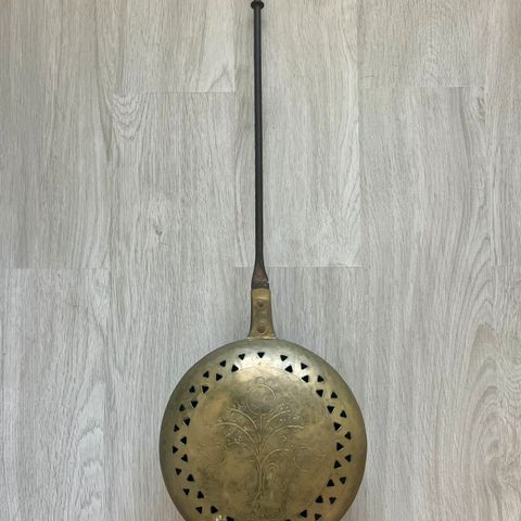 Bækkenvarmer, messing med skaft af træ / jern, 250 år gl.