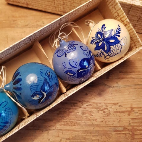 En æske med 12 flotte håndmalet træ påskeæg.