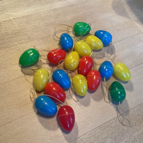 De små æg er ca. 2.3 cm. lange, snorophæng er 7 cm.