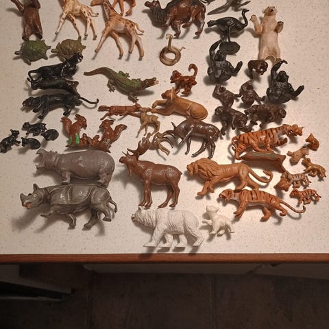Legetøj, Reisler m.fl., 15 dyr, bl.a. Reisler. Den store elefant mangler et stykke af snablen og den enen stødtand. Ellers ingen skader og mangler. Dyrene er fra begyndelsen af 1960'erne.