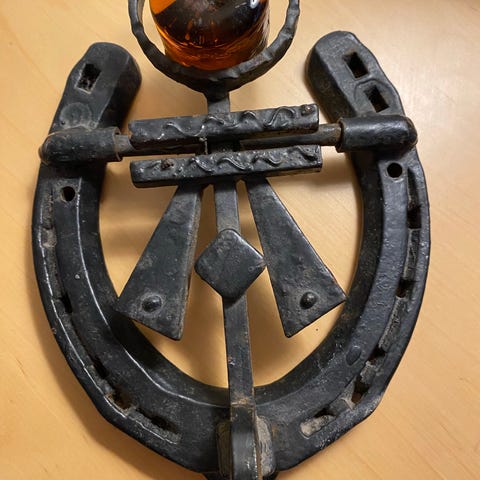 Dørhammer Med Hest Og Smed, Flot gammel dørhammer i patineret messing med en smed og hest.