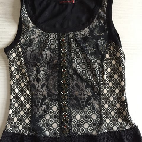 Top, Wearhouse Sita, str. 36, Grøn/sot/brunlig, Polyester/Elasten, Ubrugt, Rigtig flot top/bluse uden ærmer og med stor U-hals. Blusen er mønstret i Grøn/sot/brunlig nuancer og med små Pailletter, har sorte kanter ved hals og ærmer. Toppen har en stor flot sort blonde i underkanten af blusen og ned langs forkanten er der på små pailletter påsat i blonden. Gennemforet med lækker sort stof. Str. S. Nypris kr. 330,00