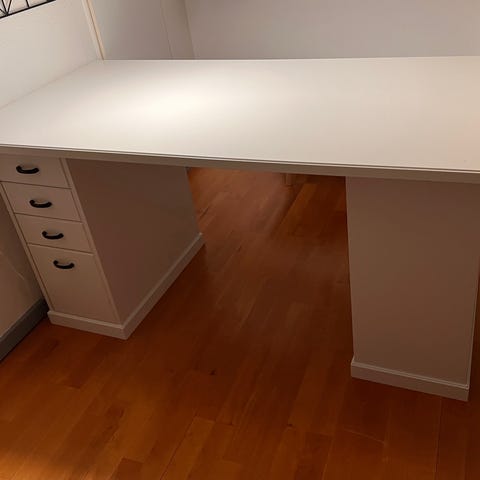 Hvid bord med sølvfarvet ben, der kan skues af og på.