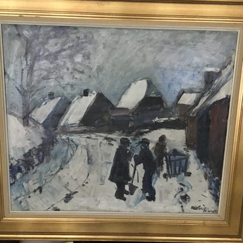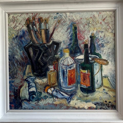 Oliemaleri, Kaj Husum 1931-2007, motiv: Landskab, stil: Modernisme, b: 74 h: 54, Rigtig flot landskabs maleri. Malet af Kai Husum, der var kunstmaler fra Brande.