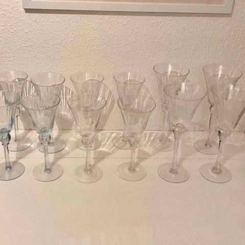 9 stk øl, 4 stk rødvin, 13 stk hvidvin , 12 cognac, 11 bitter glas , 3 større portvin 16 lidt mindre portvin, 23 snapseglas. 4 desertskåle/champagne skåle. Ialt 95 glas. Tidstypisk udtryk.