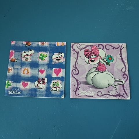 Diddl, Vægur/servietter, Sælger disse lækre Diddl sager. Et fint vægur, en pakke servietter (åbnet og der mangler et par stykker), bamse til at hænge på ruden og en lille Pimboli billedeholder