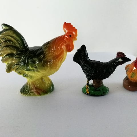 2 fine høns / haner til påskens pynt i gibs el.. materiale. De fremstår i fin stand med minimal patina. Kontroller billederne. Jeg sender gerne godt indpakket mod betaling af porto kr. 50.