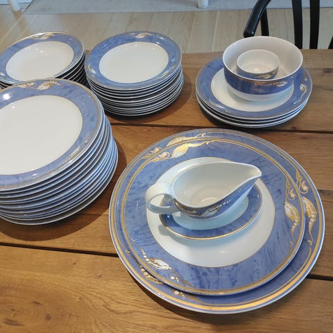 Næsten ikke brugt. Altid opbevaret med servietter i mellem. Aldrig haft i opvasker selv om der står at de godt kan tåle det. Derfor er guldkanten som ny.