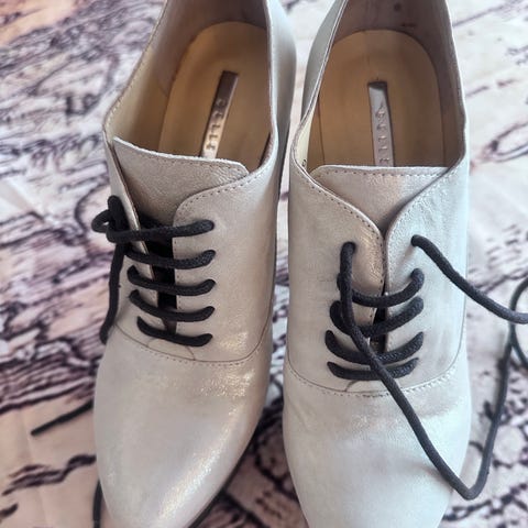 Skoene er lavet i det blødeste skind - gylden farve indvendigt og duegrå med lidt patina udvendigt. De har kun været brugt en enkelt gang og kun indendørs.