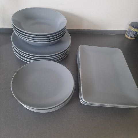 Sælger også grønt service: 4 grønne spisetallerkener og 1 lysegrøn skål, alt i god stand uden brugsspor.