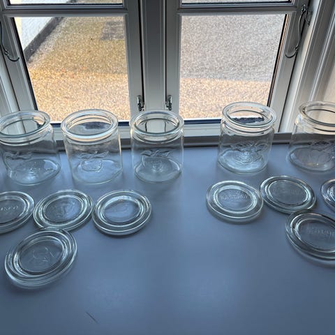 Henkogningsglas af mærkerne Holmegård Kastrup og Frisco. Ialt 27 glas med låg og bøjler men uden tætningsring.Frugtfl.6 Ved interesse kan varen beses på .sælgers adresse i Billund.