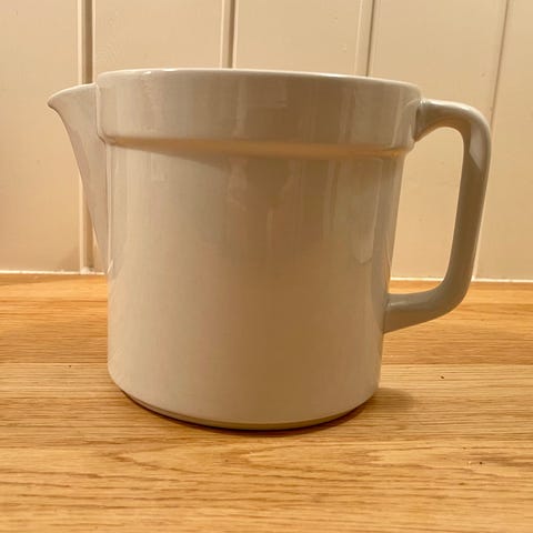 Fin flødekande og lille krukke med låg uden skår til blå kant kande er 8cm høj og krukke er 6.5cm høj og 9cm i diameter sælges samlet for 150kr