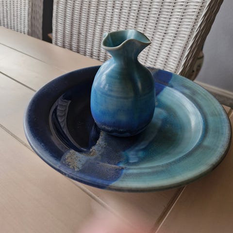 2 Lysestager, Krus, Askebæger stor, Askebæger lille. sælges samlet for kr. 4300.
