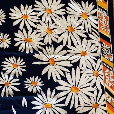 Fint tørklæde i polyester. Lyserødt med blomster i blå og gule nuancer. Mål: 75 x 74 cm.