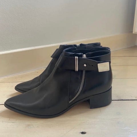 Du køber begge par som aldrig er brugt og lidt falmet i det blå som dog kan opfriskes med lidt læderfedt. Fra røg og dyrefrit hjem.