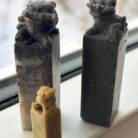 3 stk gamle Kinesiske fedtstens udskæringer .De 2 store har mindre afslag, lille H 5 cm. L. 11,5 cm. Den mellemstore H8 cm. L. 21,5 cm. Den store H. 15 cm. L 23 cm.