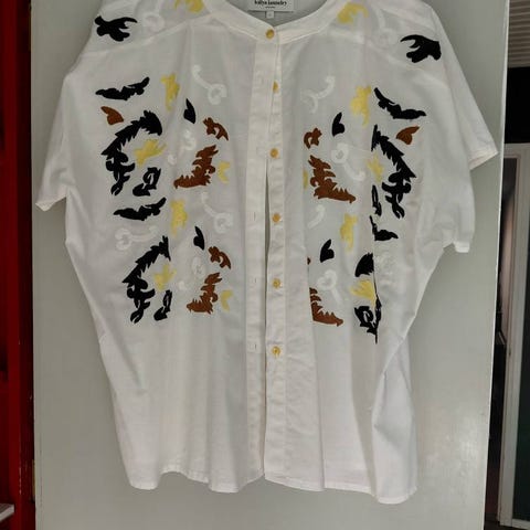 Smuk bluse/skjorte i hvid med blå blomster. Passer str. XS/S. Polyester. Nypris var 750 kr.