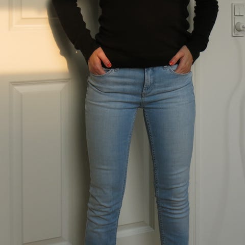 Jeans fra Topshop, model Baxter. Mellem/lav talje og smalle ben.