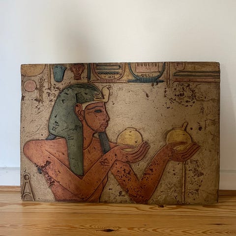 Vægrelief i cement “Kong Farao" i sin lette stridsvogn.