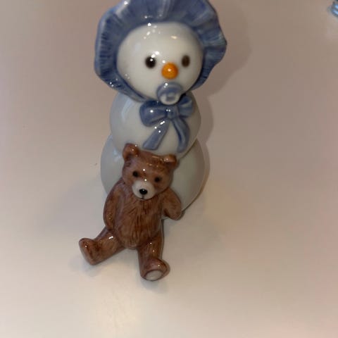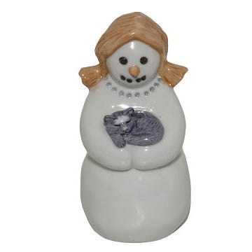 Skøn vinter / jule figur med en snemand; mor med kat i armene.