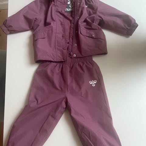 pink regnjakke fra Hummel i str. 98. den har lille zip på ærmerne. der er elastik ved ærmerene og i livet. Der er et lilla hummellogo på brystet.