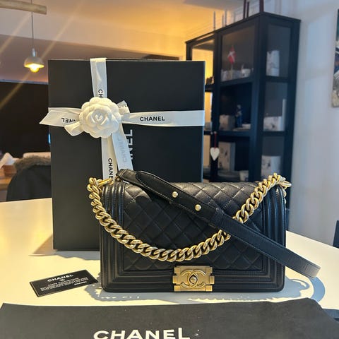 Sælger Chanel boy, old Size medium (15*25*9). Perfekt størrelse og i stort caviar, så den kan holde til alt. Kan bruges crossbody. Købt I Chanel Kbh i 2018. Brugt meget lidt og står som næsten ny. Alt medfølger. Skal man købe den fra ny koster den i dag ca.52000kr